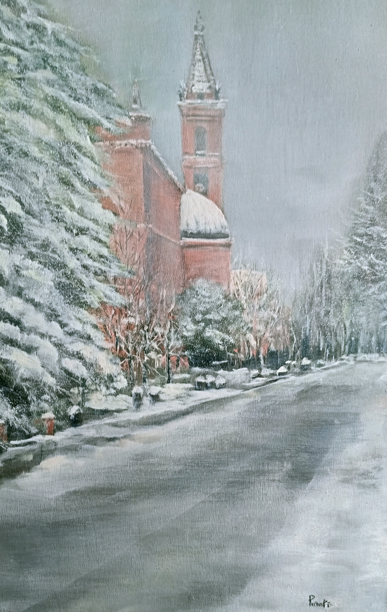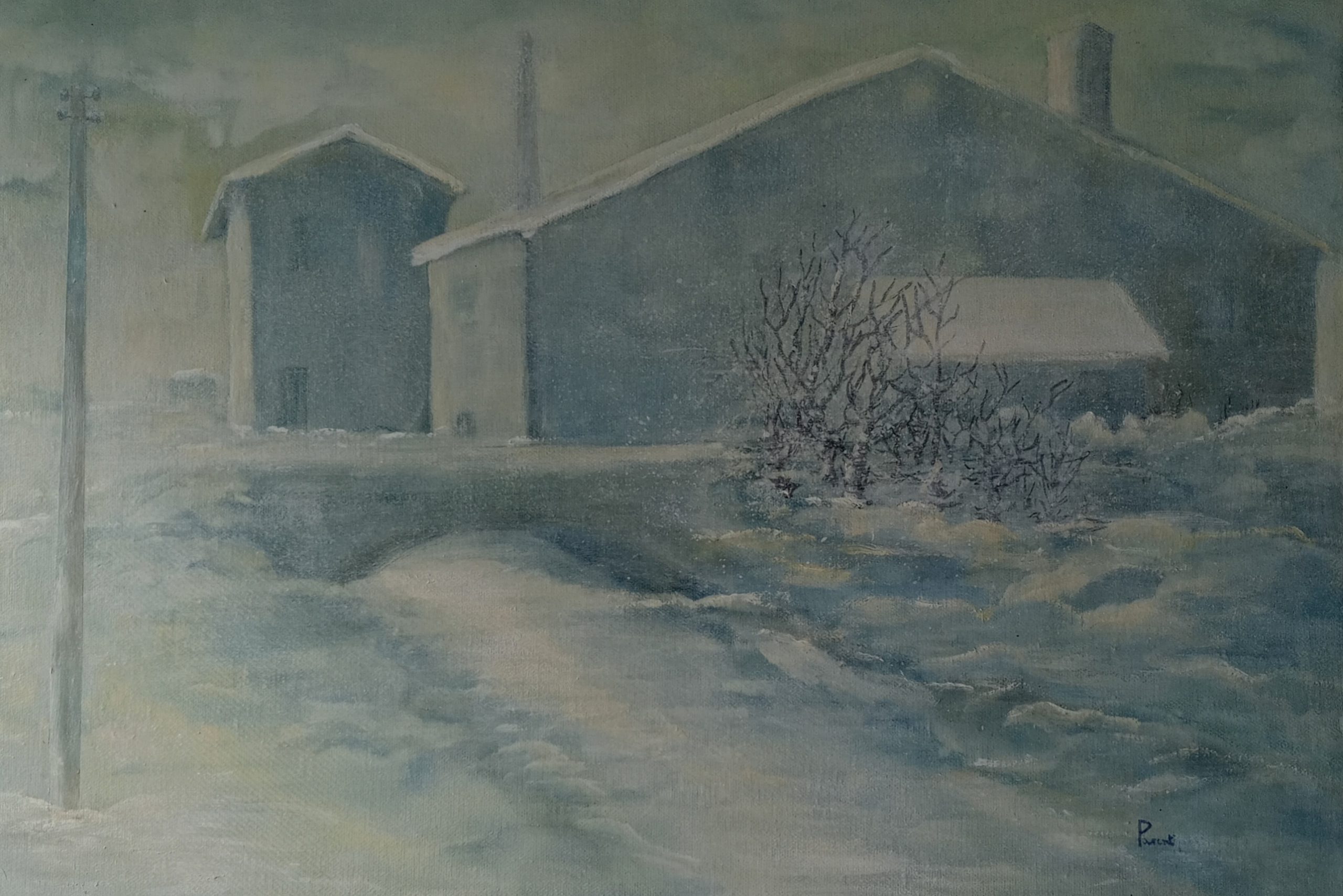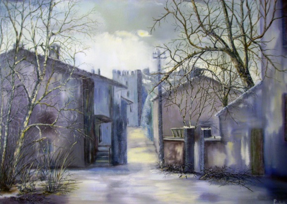 Corrado Parenti. Un paesaggista, soprattutto. Un Paesaggista come dire lirico e romantico, ma nello stesso tempo realista. Senza che ciò determini contraddizioni stilistiche e formali. Questo perchè si tratta di un pittore che ama il suo mondo di un grande ma critico e vigile amore. Così si spiega anche la ragione per cui la resa del suo paesaggio è tuttaltro che idilliaco. Sono Borgate che affiorano da sonnolenti pianure o da ondulate colline innevate, con sopra lividi cieli, gravidi di nubi vorticose e minacciose. O scorci di povere grigie case, con la patina di un tempo antichissimo, sui lunghi monotoni canali della nostra Padania. Aggrovigliate architetture di rami spogli e rinsecchiti nelle albe rigide degli interminabili inverni Appenninici, con ricorrente motivo di pli telegrafici che si inseguono in smisurate lontananze prospettiche quasi a sottolineare, con amaro disappunto, la profanata contaminazione operata dall’uomo sulla natura. Davide Roncarà